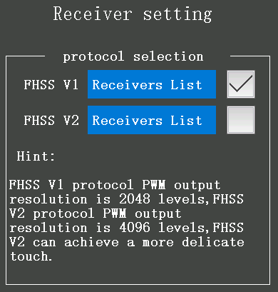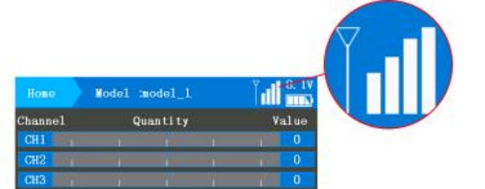 Receiver signal strength. The receiver signal strength will display on the top of the transmitter screen after the transmitter bind success with the receiver.