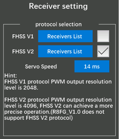 Response Latency | 3ms, 4ms, and 14ms can be selected when it is bound to RC8X, (R8FG is V2.1 or R8FG with a factory date of 2023/4/26 and later.) |