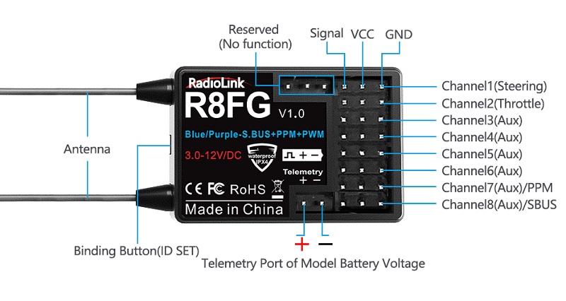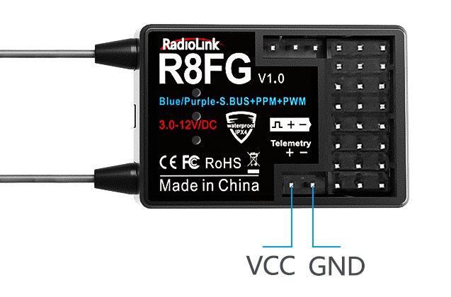Compatible Transmitter | RC8X, RC6GS V3, RC4GS V3, RC6GS V2, RC4GS V2, RC6GS, RC4GS, T8FB, T8S |