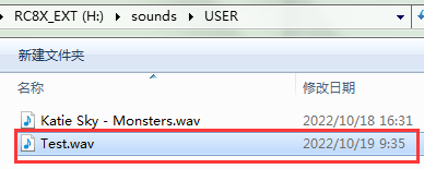 Please refer to 2.8.2 SD Card Files Copy Methods to copy the modified audio to RC8X_EXT(H) -sounds-USER. (The file name is "Test")