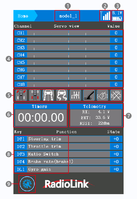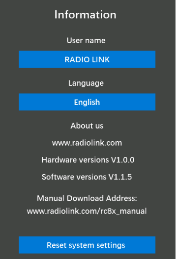 Long press the HOME button about 1.5 seconds, and the RC8X will show RadioLink Logo, and the welcome to RadioLink sound is emitted at the same time, the home page will display this information as in the picture below: