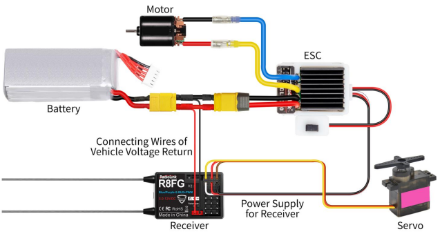 RC8X is easily adapted for various battery layouts with wide operating voltage of 7.2V to 17V, which can use 8 pieces of AAA batteries, a 6S Ni-MH battery or a 2S-4S LiPo battery. Universal JST connector with the voltage protection software of RadioLink ensures vital components are protected from a reverse polarity connection.