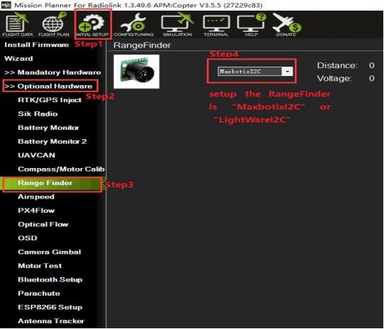 Mission Planner setup: INITIAL SETUP - Optional Hardware- Range Finder- Click the pull-down menu and choose MAXBOTIX12C or LIGHTWAREI2C