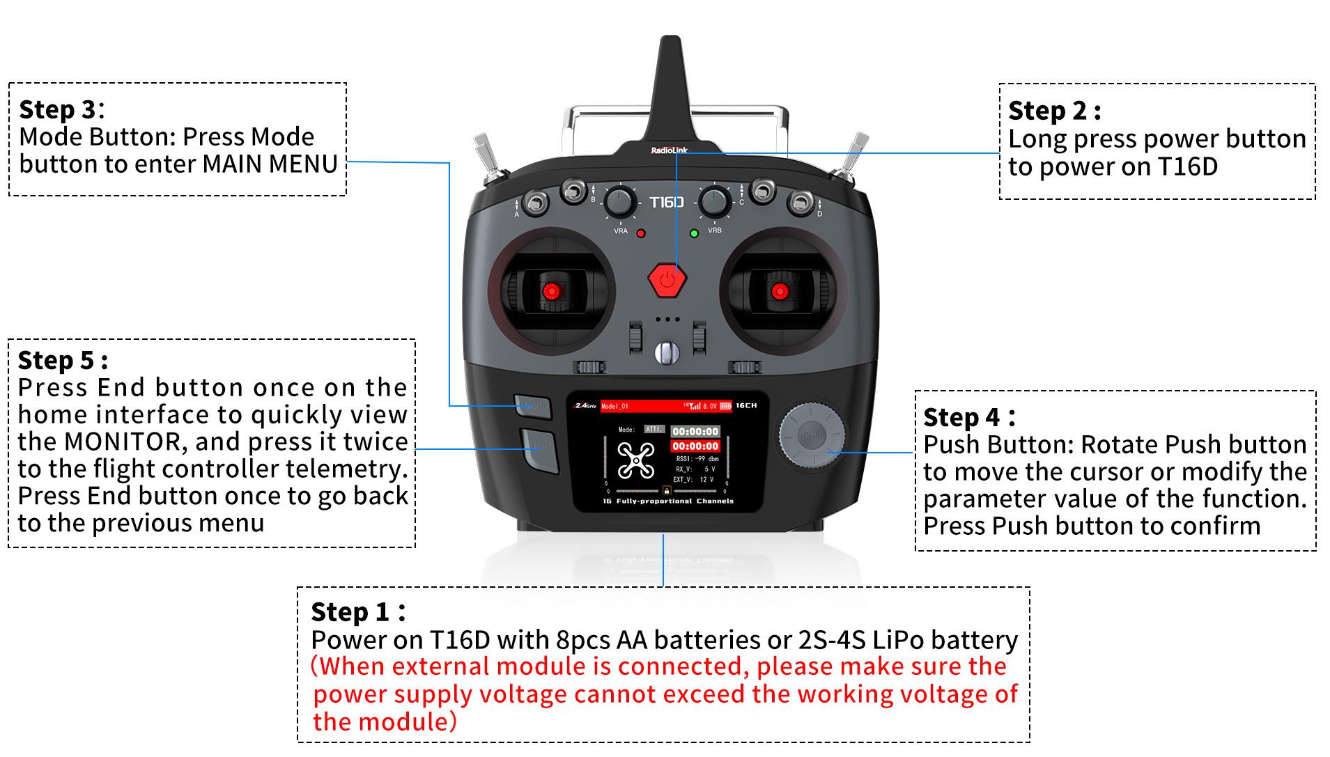 Install the external module on T16D. Power on T16D and the receiver (The receiver can be connected to the TELEM port of the flight controller. Supply power to the flight controller to power on the receiver.).