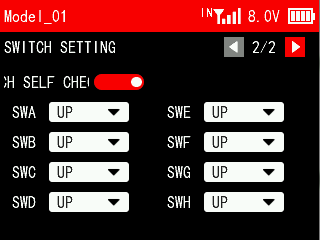 Fail safe is an important safety setting. When the signal is lost, it can be used to protect the model from loss or reduce the degree of loss. It can also play a certain protective role in personnel safety. This function sets the output value performed by each channel when the signal is lost. All channels default to 0% and can be customized according to the needs of the device.