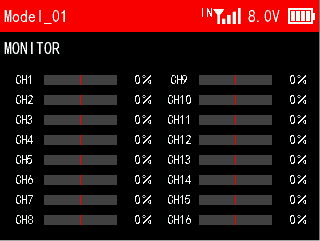 After powering on T16D, press End button once on the home interface to quickly view the MONITOR, and press it twice to the flight controller telemetry(See picture below).