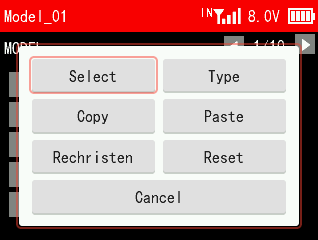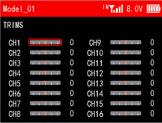 ① The name of the current model. You can select different models in Transmitter Settings - MODEL interface. T16D can support up to 100 sets of model storage. Before operating the model, be sure to check whether the model on the screen is consistent with the actual model used. If you select the wrong model, the movement, direction and neutral position settings of the servo will be wrong. Operating the remote control at this time may cause damage to the model.