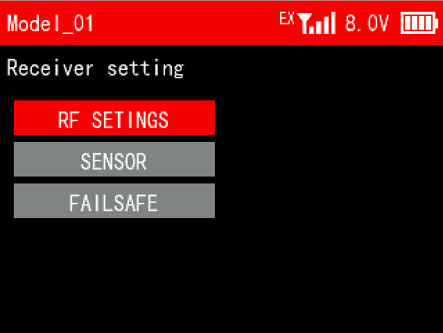 This chapter introduces all functions in the menu Receiver Settings, including RF SETTINGS, SUBSIDIARY ID, SENSOR, and FAILSAFE.