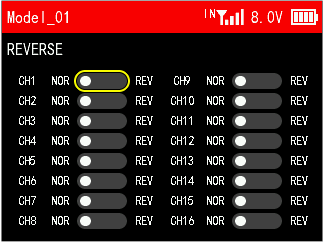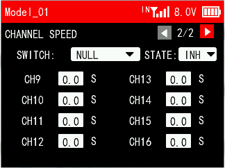 SERVO SPEED: Servo response speed. 14ms, 4ms, 3ms can be selected. 14ms is the response speed of the analog servo. 4ms and 3ms are the response speeds of the digital servo. If you are using a digital servo, you can select a servo speed of 4ms or 3ms. Please confirm whether the receiver you are using supports digital servo.