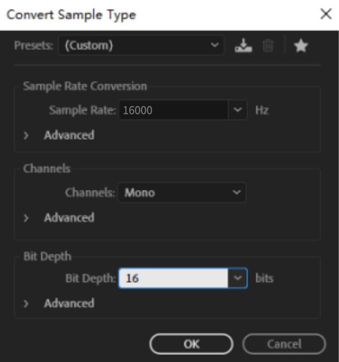 Modify the voice file format to ensure that the format conforms to WAV format, Sample rate 16KHZ or 32KHZ, monophonic, and 16 bits depth. After selecting the save location, click OK, and a qualified voice file will be generated.