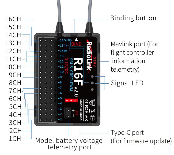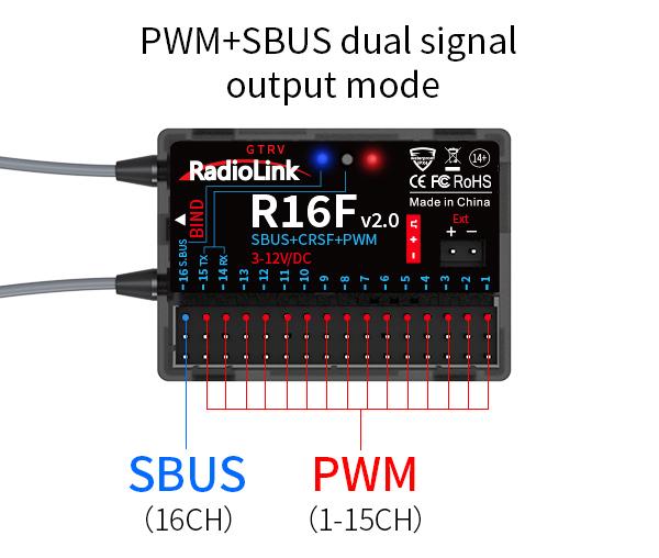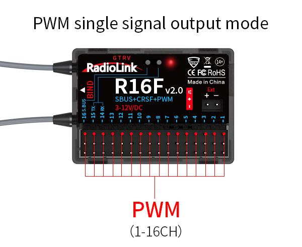 CH1 to CH15 output PWM signal output while CH16 outputs SBUS signal.