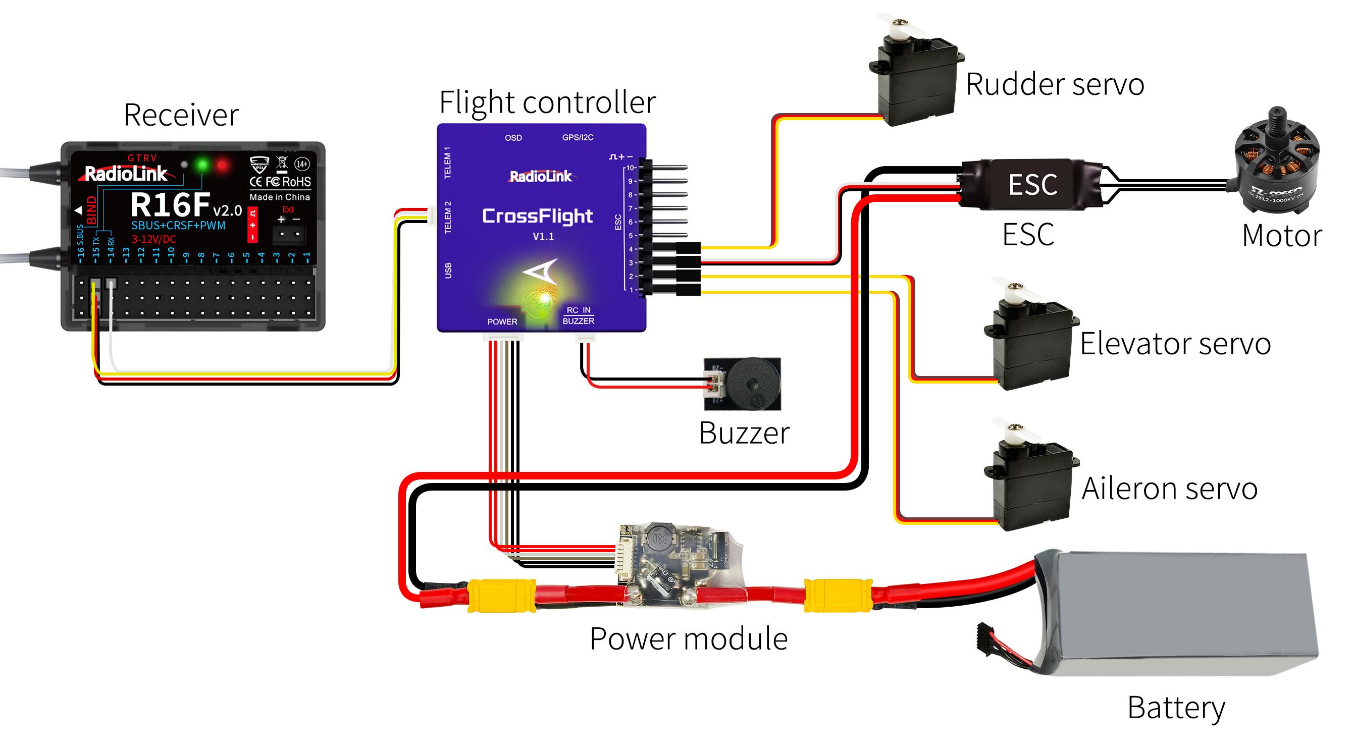 Switch the working mode of R16F to CRSF working mode and connect it to CrossFlight. Take TELEM1 as en example.