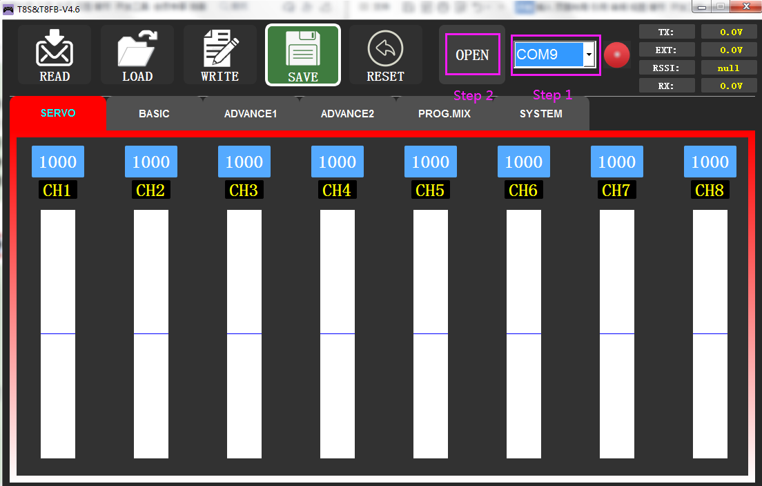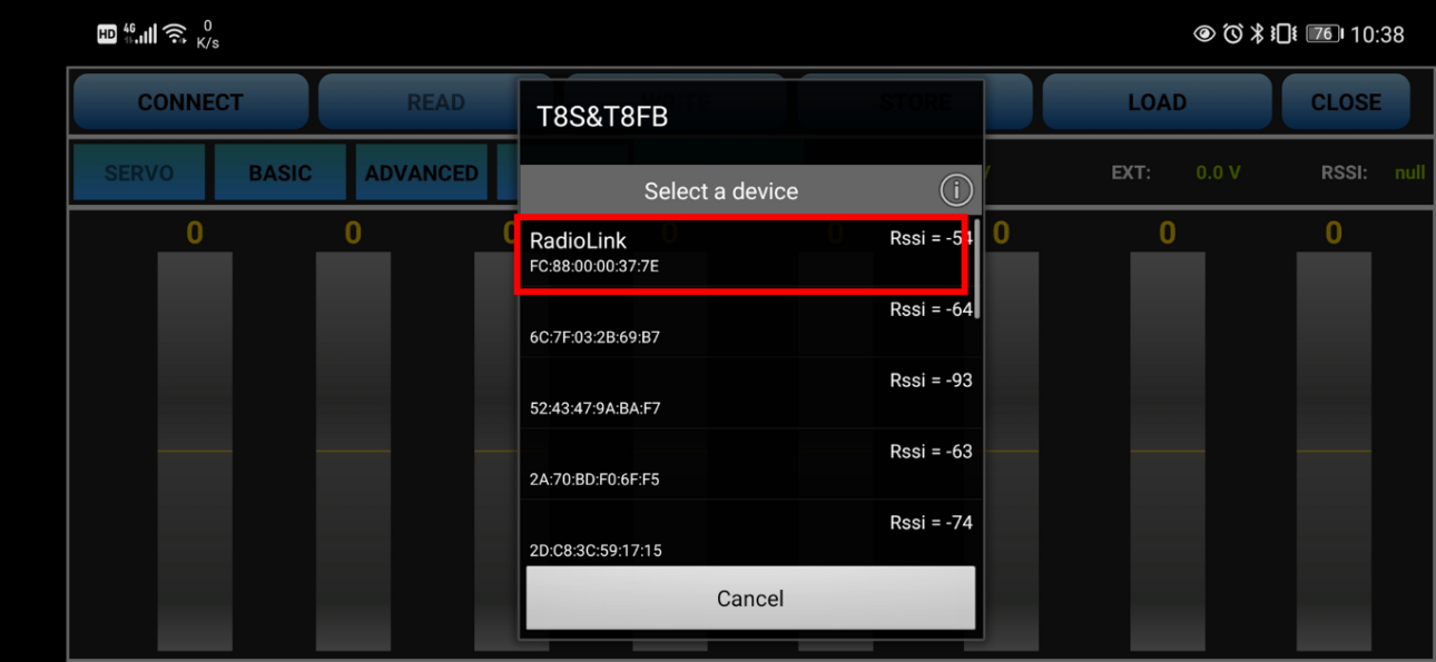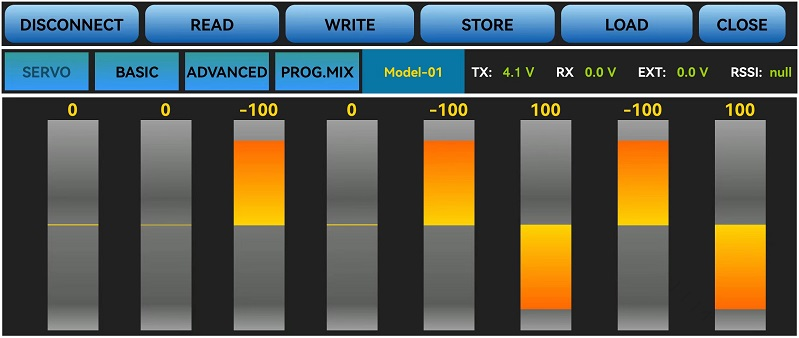 (DIS)CONNECT: When the APP is opened and the T8FB is powered on, click CONNECT, and a list of Bluetooth devices will pop out and select the RadioLink device to make connection. The two LED at the rightmost will flash with DD sounds, press any of the trimmer buttons to stop the DD sounds and the servo range will display on the APP. If fails, press DISCONNECT and CONNECT again.