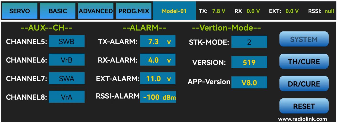 To return the model voltage, RadioLink receivers of telemetry functions R8XM, R8FG, R7FG or R8F should be used. Small adjustments are also supported. When the model voltage goes lower than the set value, T8FB will make “DDD” sounds as a unit to warn. We suggest that 7.4V set for 2S lithium battery, 11.1V set for 3S lithium battery, 14.8V set for 4S lithium battery.