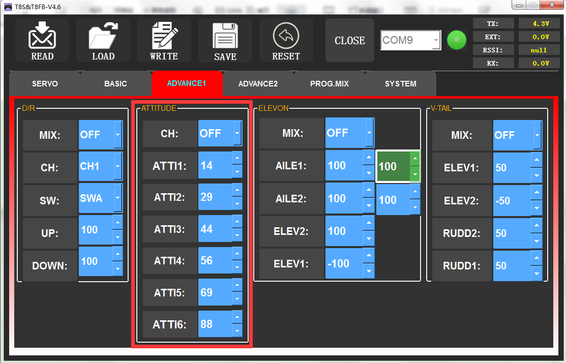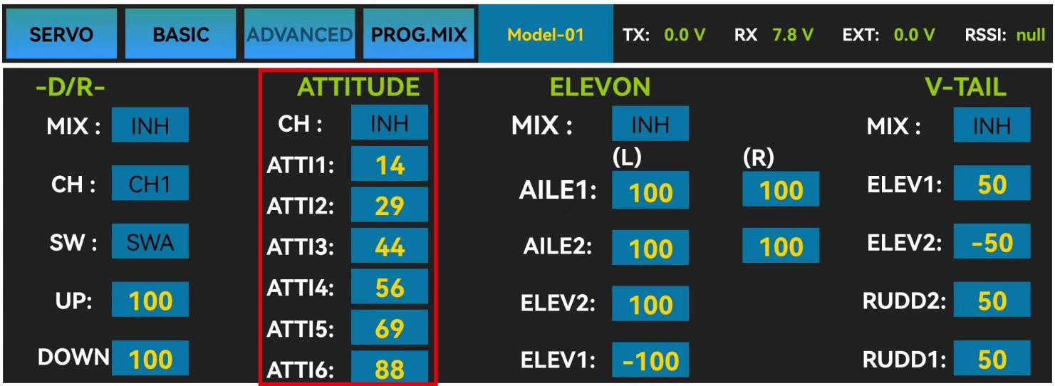Different values can be set for ATTI 1 to ATTI 6. Then you can change the flight attitude by press CH5/CH7.
