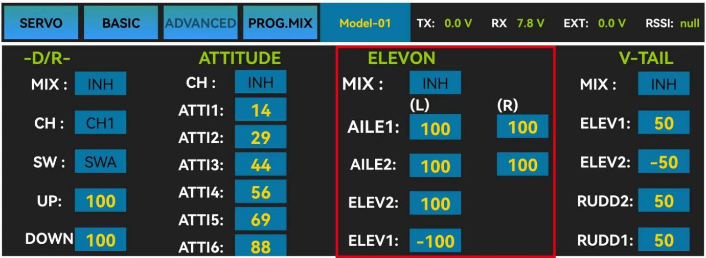 “Elevator mix” is also known as “delta wing mix”. It is often used for delta wing aircraft. Two servos can control two servos surfaces that on the left and right sides of the aircraft separately, and operate aileron function and elevator function.