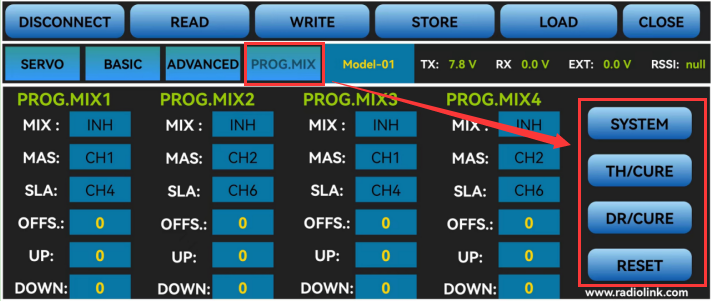 The setup menu includes: SERVO, BASIC, ADVANCE, PROG.MIX. After click PROG.MIX, there are 4 PROG.MIX setting, SYSTEM, TH/CURE, DR/CURE, RESET. For detailed setting method, please refer to 3.2 Basic Menu.