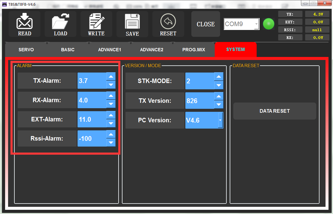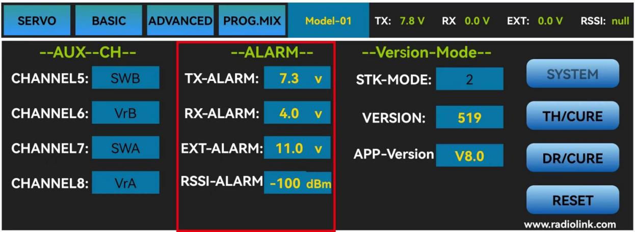 The default signal strength alarm value of the T8FB is -100dBm. You can set a reasonable value according to the actual situation to prevent the model from losing control due to weak signal. When the RSSI goes lower than value you set, T8FB will make ”DDDD” sounds as a unit to warn.