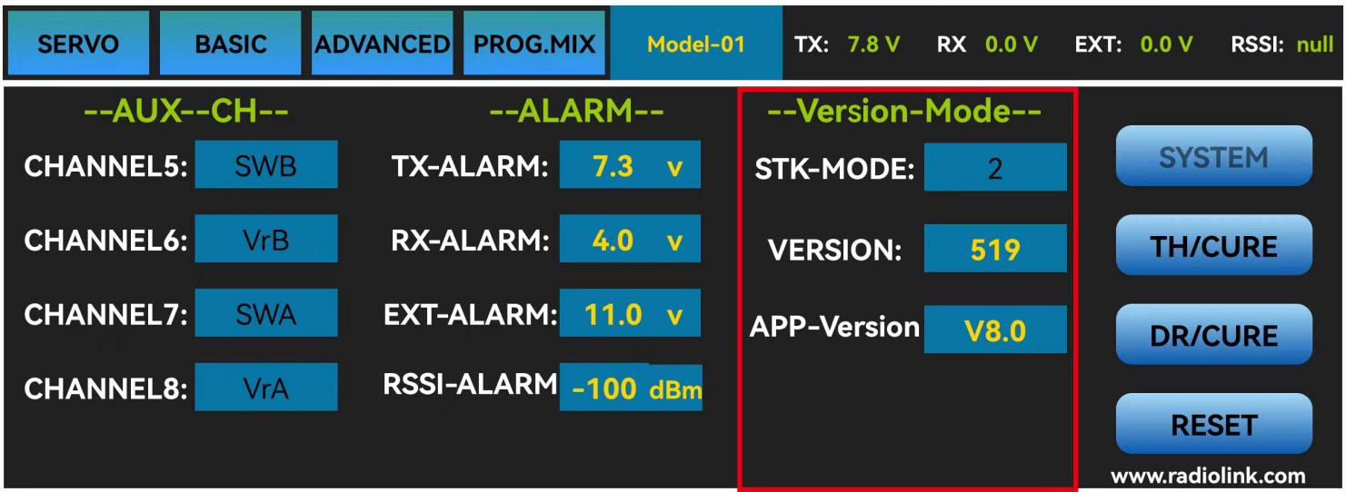 Note: Each interface can display the transmitter voltage, receiver voltage, RSSI value, and telemetry battery voltage (Telemetry function is available when using R8FG, R7FG, R8F, R8XM receivers ).