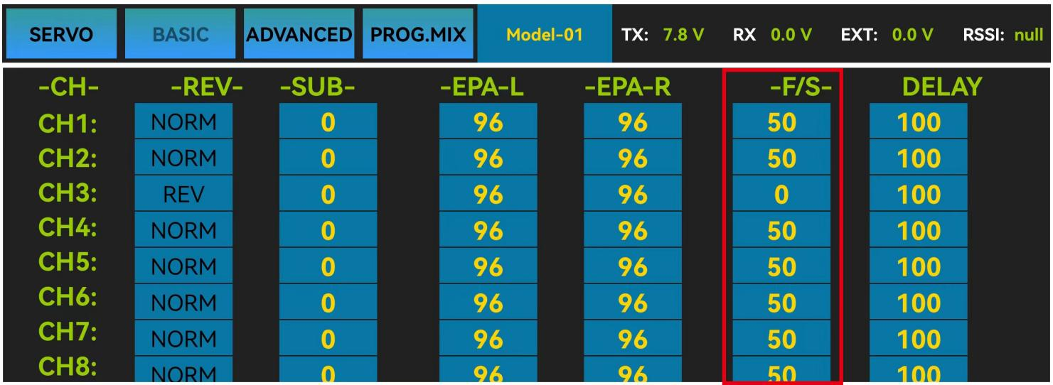 If the flight has reached the limit control distance, there is strong interference in the flight area, there are obstacles between the transmitter and the receiver, or T8FB low voltage it will cause loss of control. At this time, you can set the Fail-Safe, so that the model can maintain working at the F/S value you set after loss of control. F/S needs to be set in advance. Each channel can be set independently.