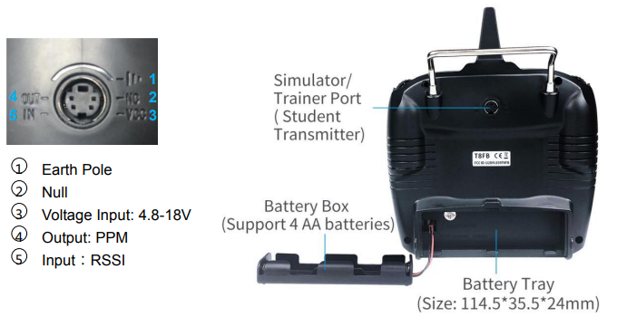 Power supply battery selection for T8FB: You can use the standard battery box with 4 pieces AA batteries for power supply, or use lithium batteries (2S/3S/4S) to supply power.
