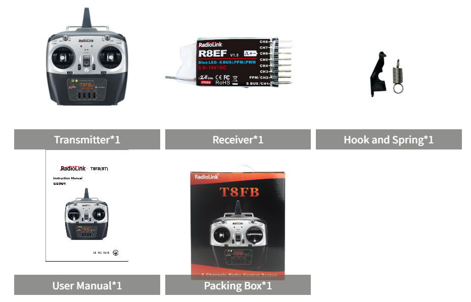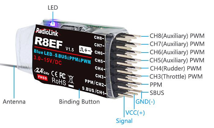 The standard receiver packed with T8FB is R8EF, an 8-channel receiver with PWM and SBUS/PPM signal output supported.