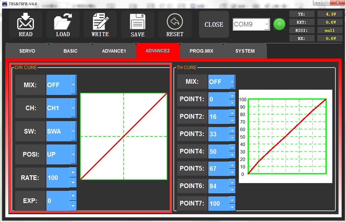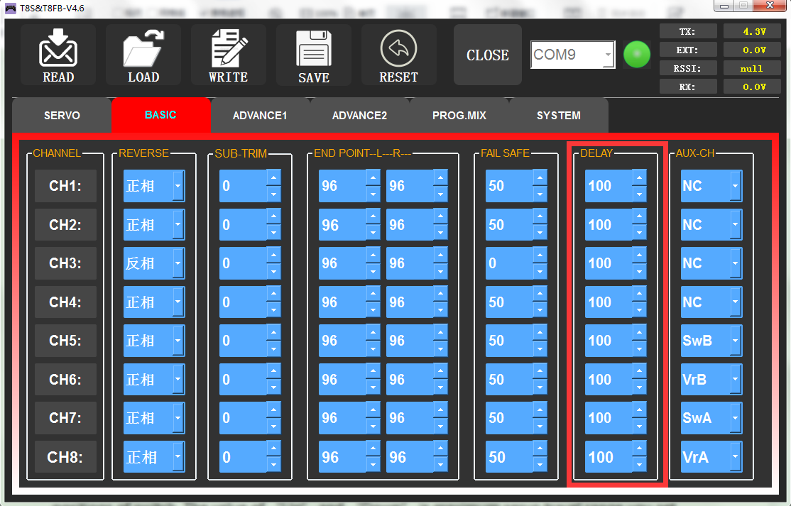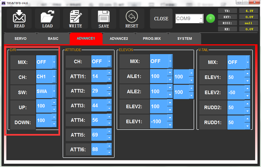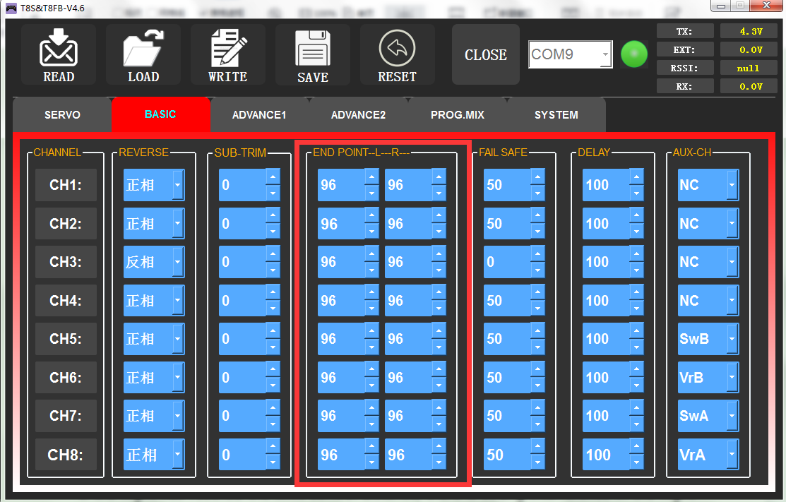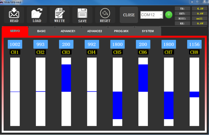 When setting one channel for different servo travel range, click “WRITE” after setting D/R value for the corresponding channel. When setting 4 channels for different servo travel range at the same time, click “WRITE” after setting D/R value for each channel. For example: after setting D/R value of channel 1, click “WRITE” to save the settings, and then switch the channel to “CH2”. Set D/R value of channel 2, and then click “WRITE” to save the settings. Repeat this step for channel 3 and channel 4.