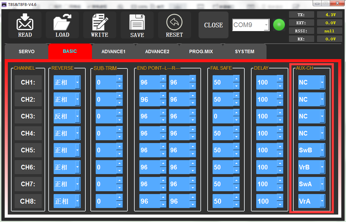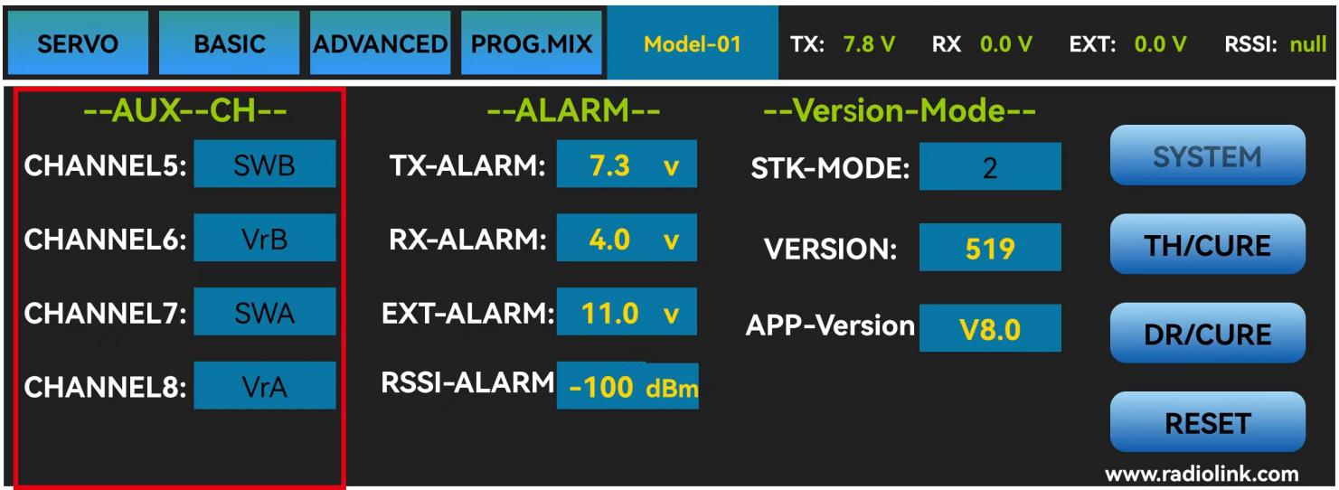 Click the auxiliary function of CH5/6/7/8, there will be five options of “SWA”, “SWB”, “VrA”, “VrB” and “NULL” for selection.” NULL “means no switch control.