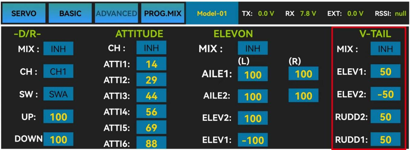 V-TAIL used for fixed wing with v-tail. Two servos can control two servos surfaces that on the left and right sides of the aircraft separately, and operate aileron function and elevator function.