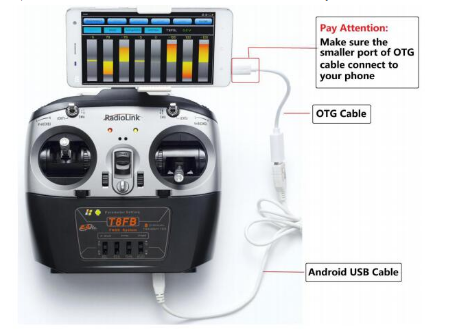 A: When there are multiple parameter setup apps running at the back stage, extra data will be read as the servo range displays are not encrypted. Thus, turn off all the running apps, reconnect T8FB to mobile with the USB cable and OTG cable. Click ALLOW to open the APP when the notice pops out asking for open permission.