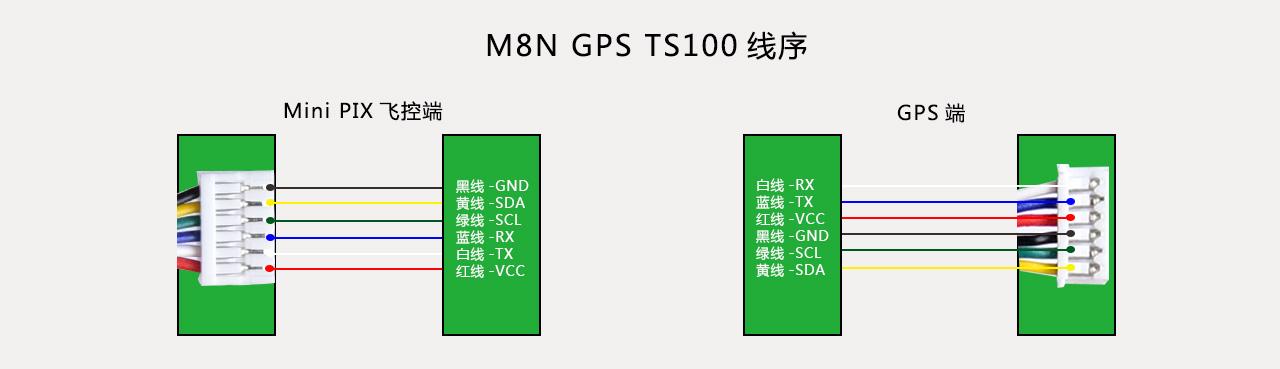 GPS主板端:白线-RX;蓝线-TX;红线-VCC;黑线-GND;绿线-SCL;黄线-SDATS100